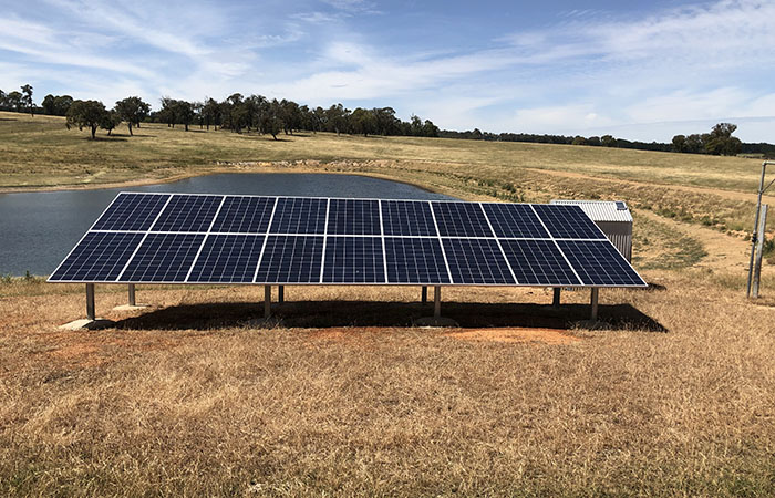As there was no power on site, solar was the preferred pumping method. We designed a 3 kw 3 phase electric submersible to be floated in the dam to pump through 75mm rising main to a 200kl steel balance tank.